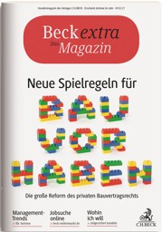 Bauprojekte haben es in sich. Dabei sorgen nicht nur Großprojekte für Schlagzeilen. Bereits die Sanierung eines Badezimmers kann zum Streitfall werden. Mehr Klarheit soll ab kommendem Jahr das neue Bauvertragsrecht bringen. Arbeitslos macht die Reform Baujuristen aber keineswegs. Wie der Präsident des Deutschen Baugerichtstags, Stefan Leupertz, im Titelinterview berichtet, bergen die Vorschriften genügend neues Konfliktpotenzial. Zur Erschließung weiterer Geschäftsfelder lohnt für Juristen ein Blick in die aktuelle Managementliteratur. Digitale Transformation, Industrie 4.0 und Design Thinking lauten nur einige der neuen Trends. Die Rubrik „Schlau durch den Alltag“ stellt empfehlenswerte Managementbücher vor. Zukunftsweisend präsentiert sich auch der Beck-Stellenmarkt mit einem Relaunch im Internet. Beckextra hat sich durch Deutschlands große Jobbörse für Juristen und Kanzleiberufe geklickt und erklärt die neuen Funktionen. Sollten Sie die Sommerferien für eine persönliche Standortbestimmung verwenden, gibt Ihnen der Ratgeberbeitrag „Weil ich weiß, wohin ich will“ einige Inspirationen mit auf den Weg.
