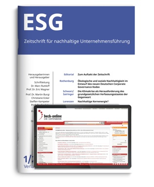 Der Bereich Environmental Social Governance (ESG) – das heißt Umwelt, Soziales und Unternehmensführung – gewinnt immer stärker an Bedeutung. Die neue ESG – Rechtszeitschrift für nachhaltige Unternehmensführung befasst sich vor allem aus juristischer Sicht, aber auch unter Einbeziehung weiterer Disziplinen wie Wirtschaftsprüfung, Ökonomie, Sozial- und Naturwissenschaften, mit der Thematik. Die monatlich bei C.H.BECK erscheinende Zeitschrift gibt einen umfassenden Überblick über die verschiedenen Themenbereiche und deren aktuelle Entwicklungen.