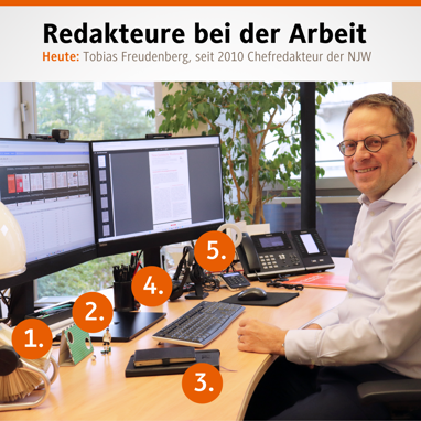 In unserer neuen Rubrik "Redakteure bei der Arbeit" gewähren wir Ihnen exklusive Einblicke in den Alltag unserer Fachredakteurinnen und Fachredakteure: Heute: Tobias Freudenberg, Schriftleiter der Neuen Juristischen Wochenschrift (NJW), an seinem Schreibtisch.